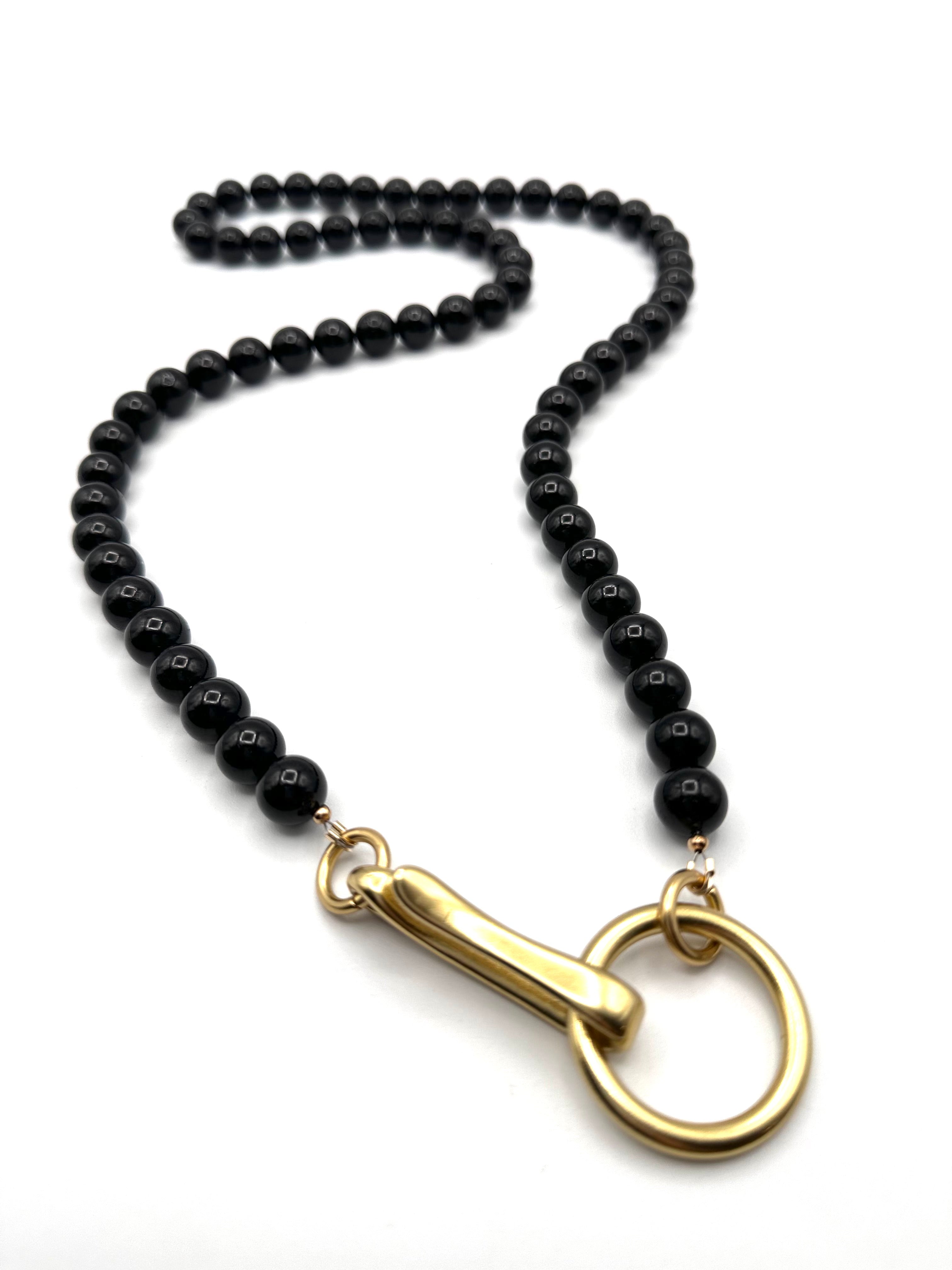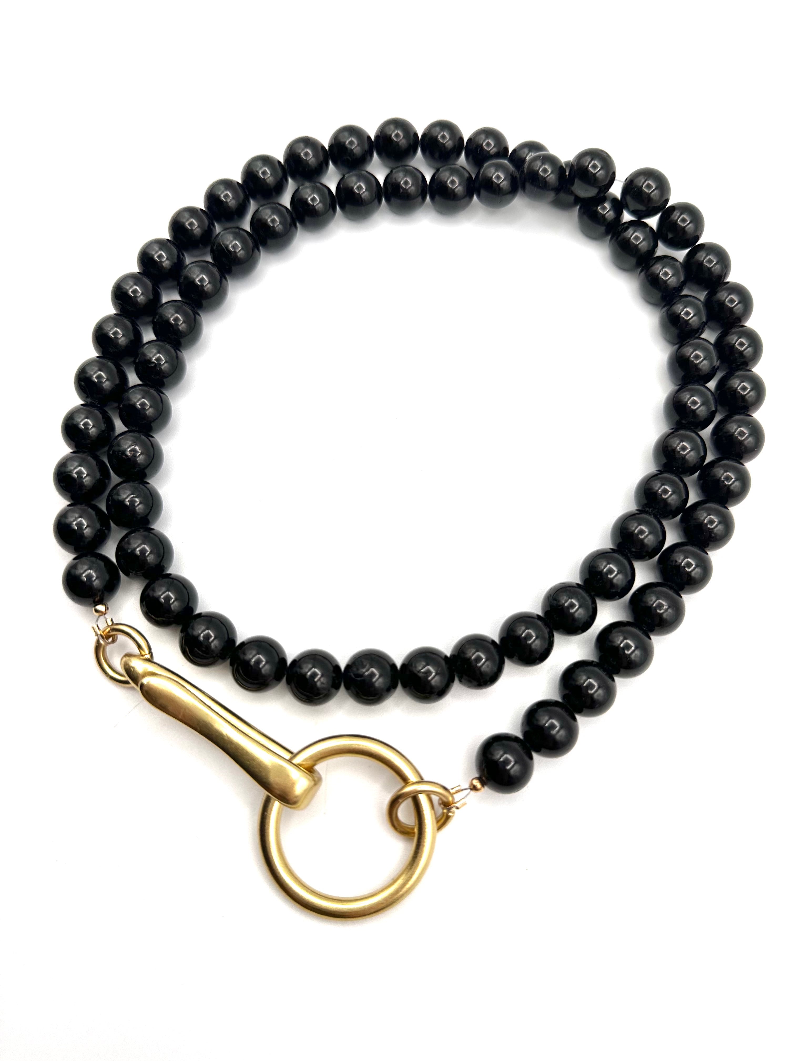 Black Tourmaline Armour is a new variation of our classic Onyx Armour — bold, protective, and crafted for the sensitive soul. Made with a single strand of powerful 12mm Black Tourmaline beads and finished with our signature natural brass fish-hook clasp, this piece offers a sleek, modern take on one of our most beloved styles. It can be worn long with the clasp in front or back, doubled for a choker-style fit, or layered with other Armour for added depth.