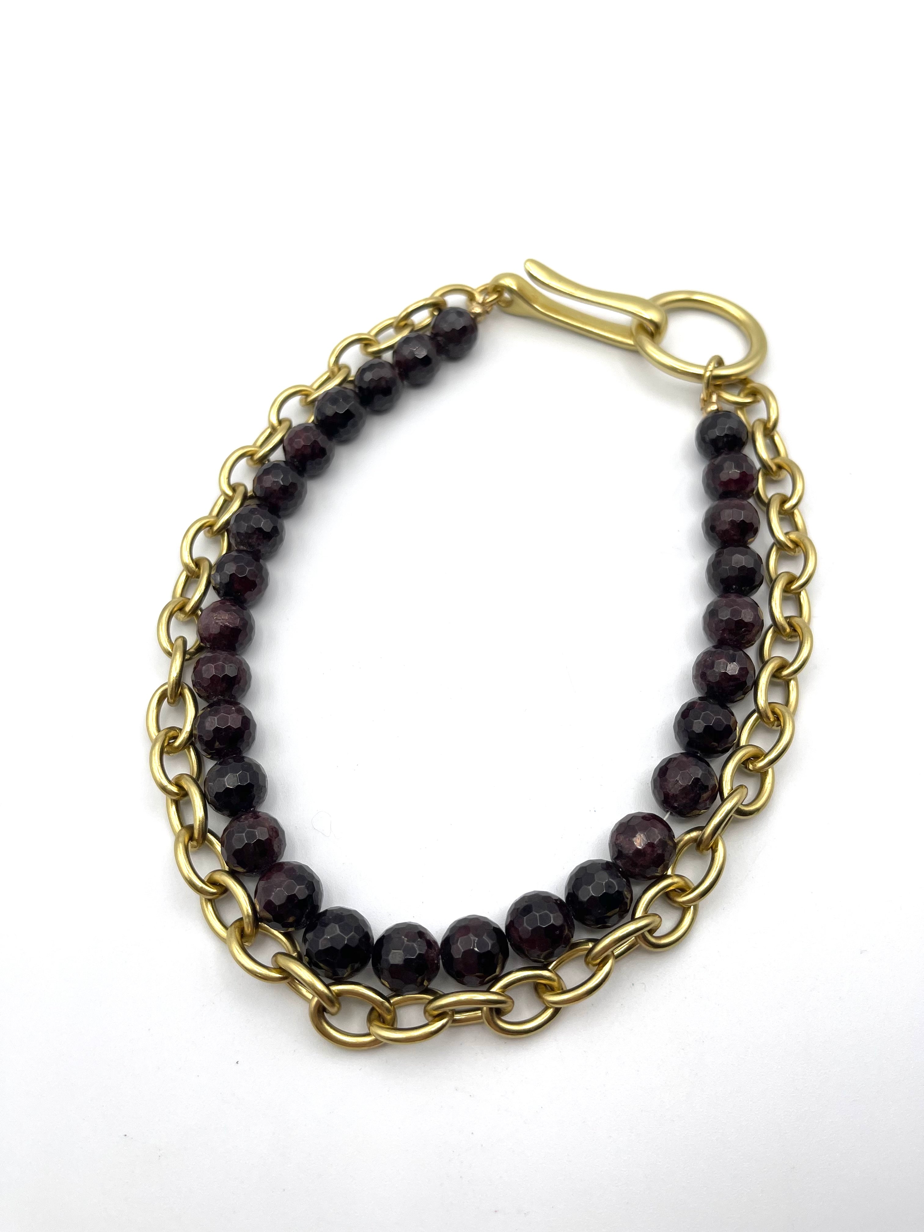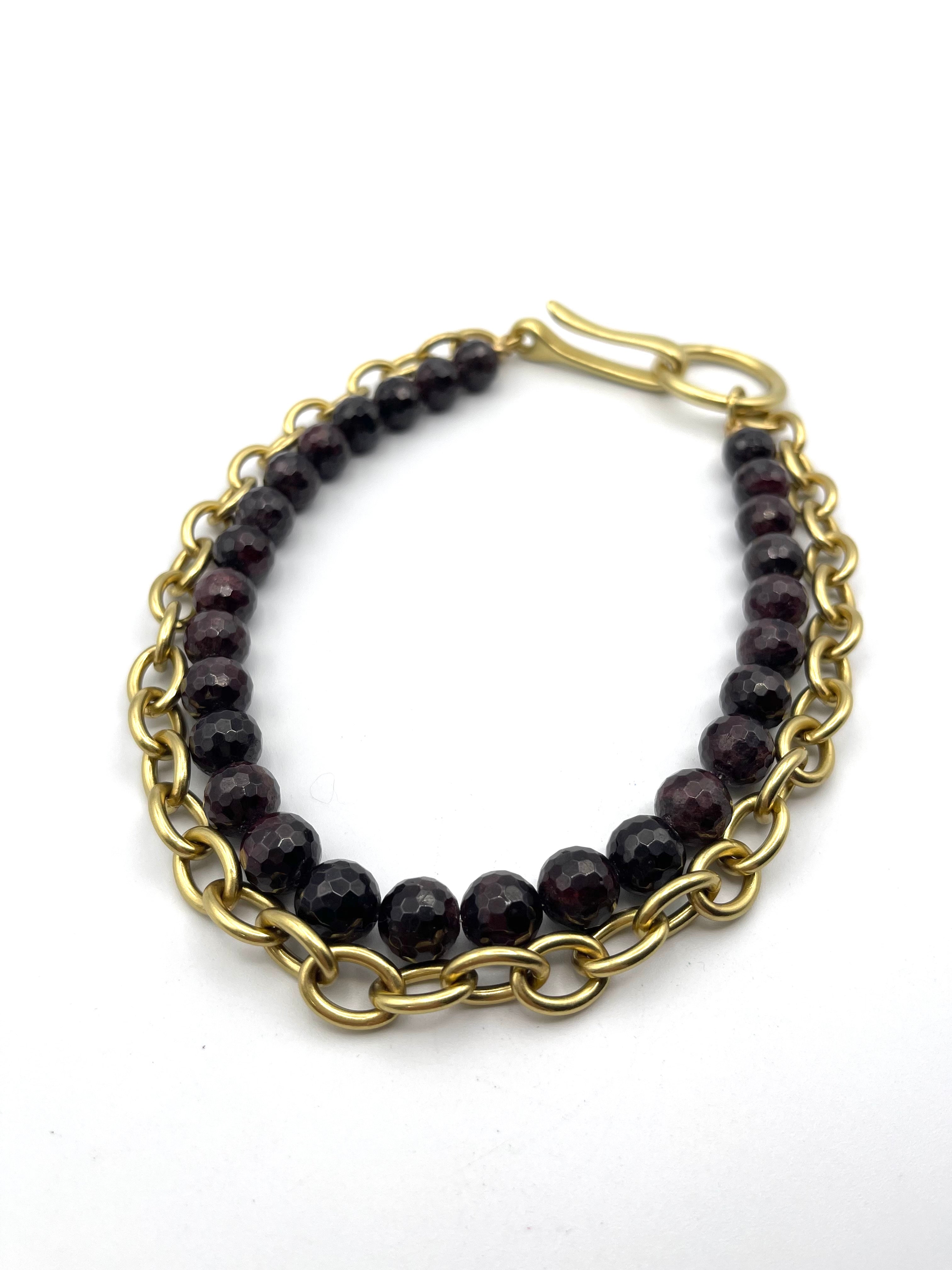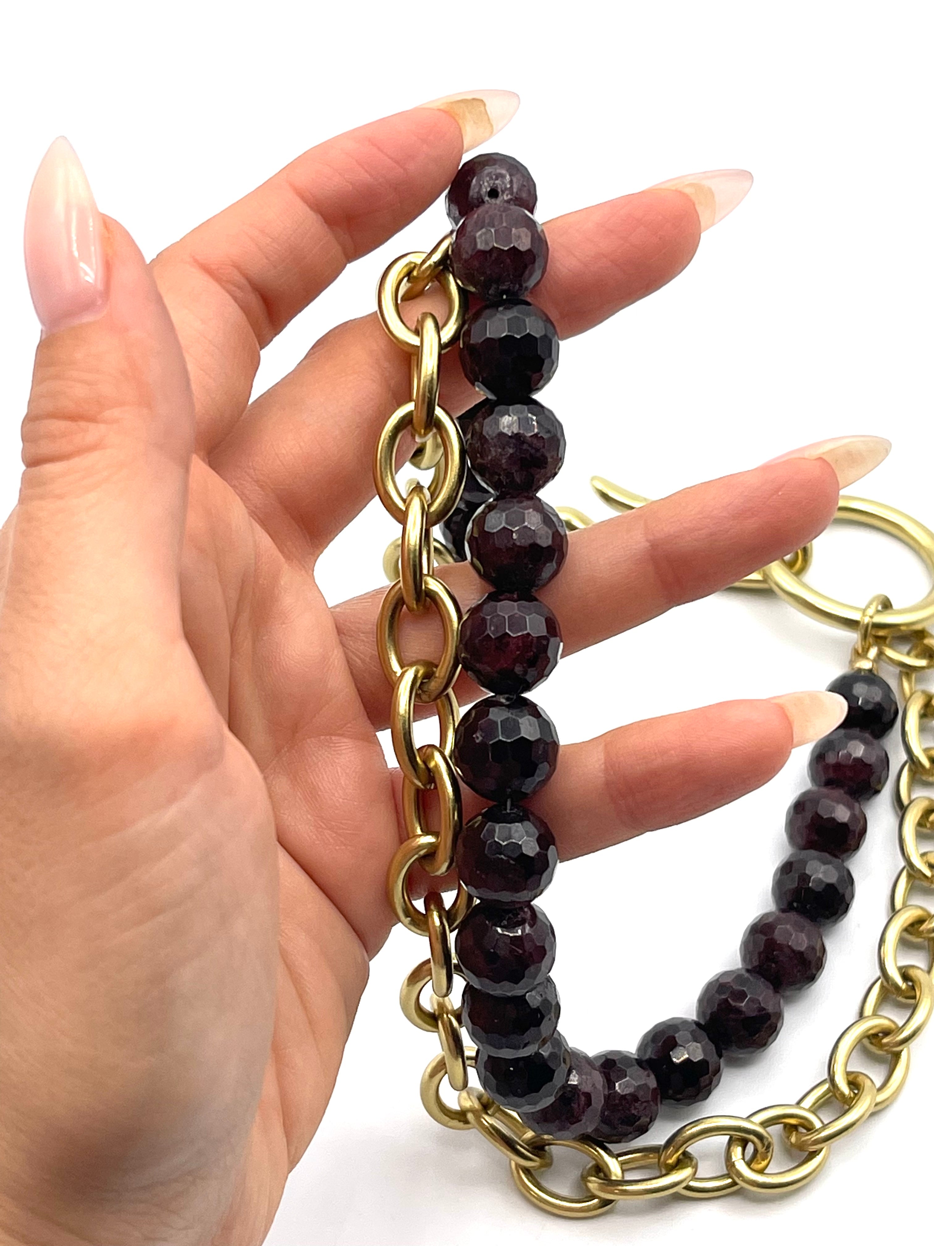 This Garnet Armour necklace features a strand of rich, 12mm faceted Garnet beads — a stone long associated with clarity, equilibrium, and the strengthening of meaningful bonds. Deep red with flashes of inner fire, each bead carries a grounding radiance that feels both steadying and empowering. Paired with our Medium Oval Link brass chain, this piece blends bold texture with timeless elegance.