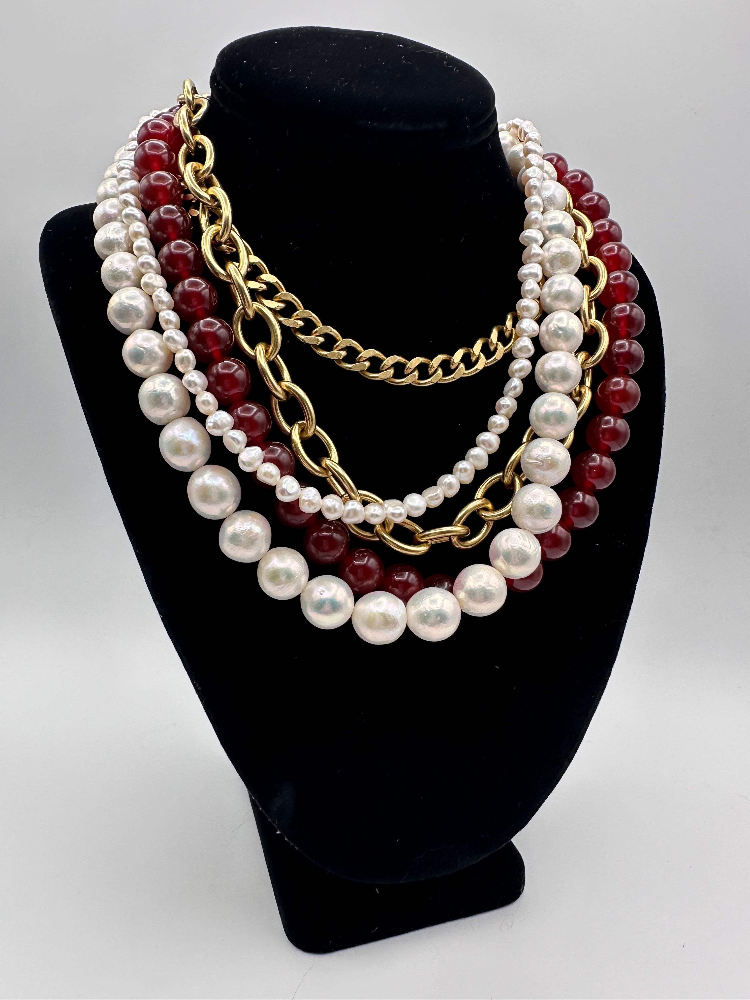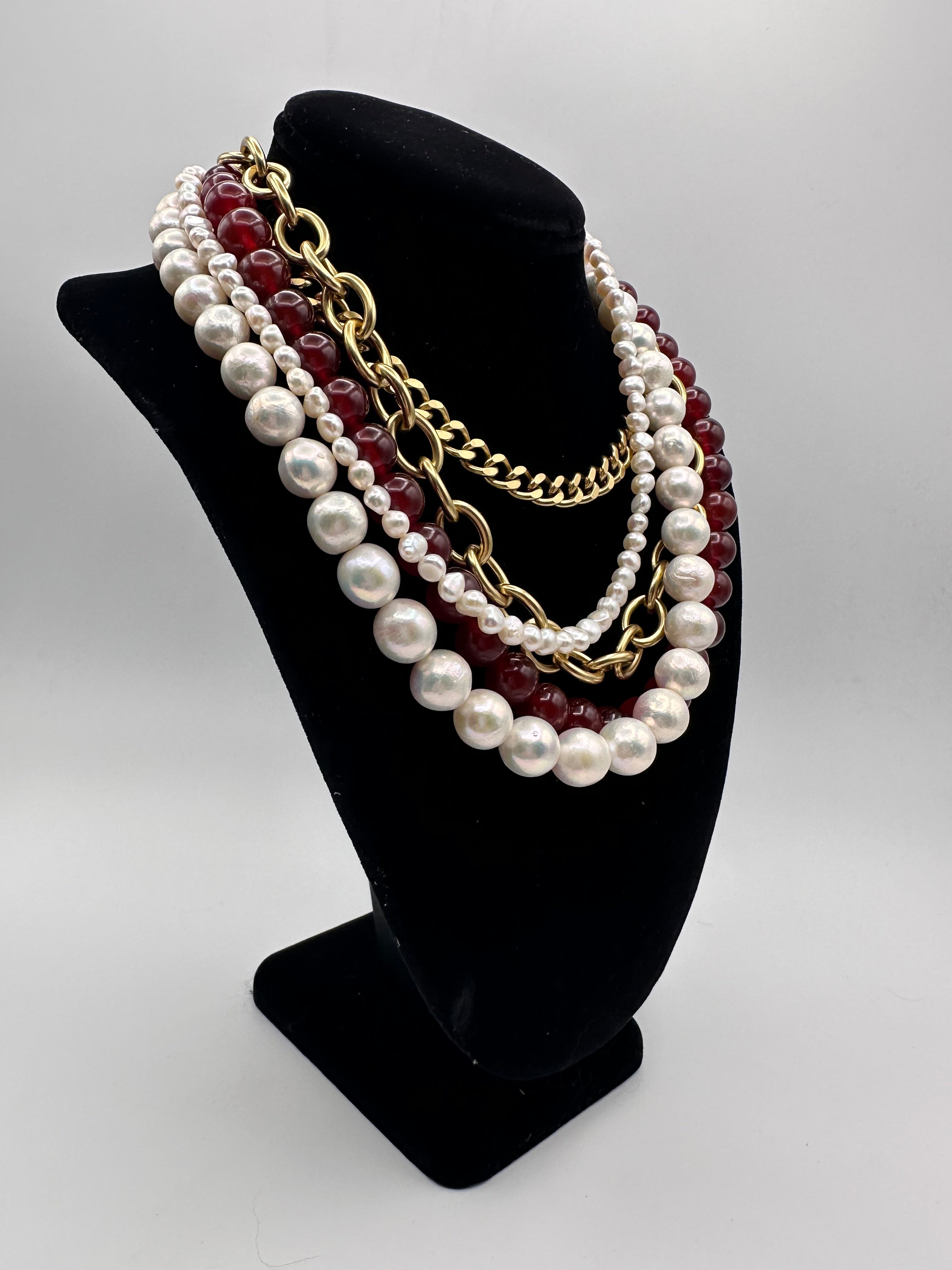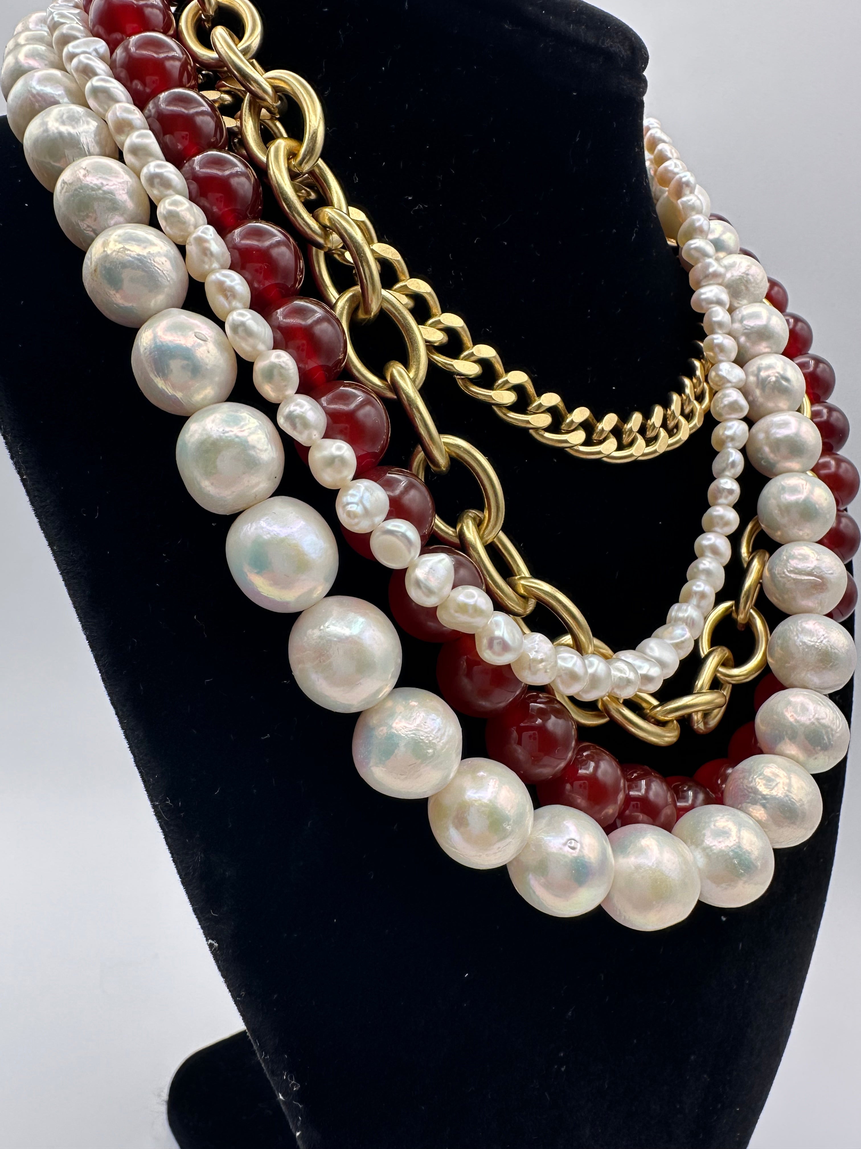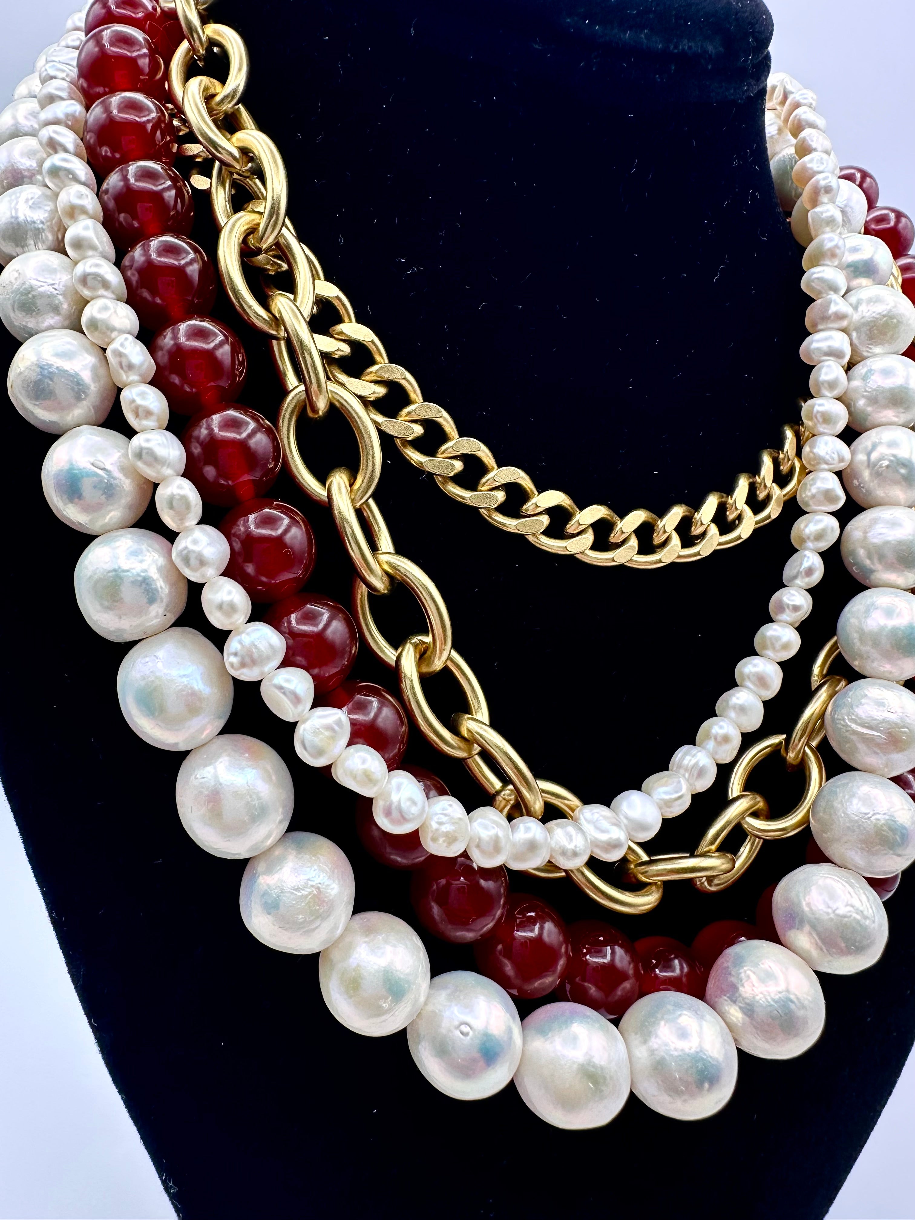 This piece is comprised of 5 strands, small 10mm peach pearls, 14mm pearl, 14mm carnelian beads, small Cuban link chain and small Oval link chain with a bold large brass clasp.