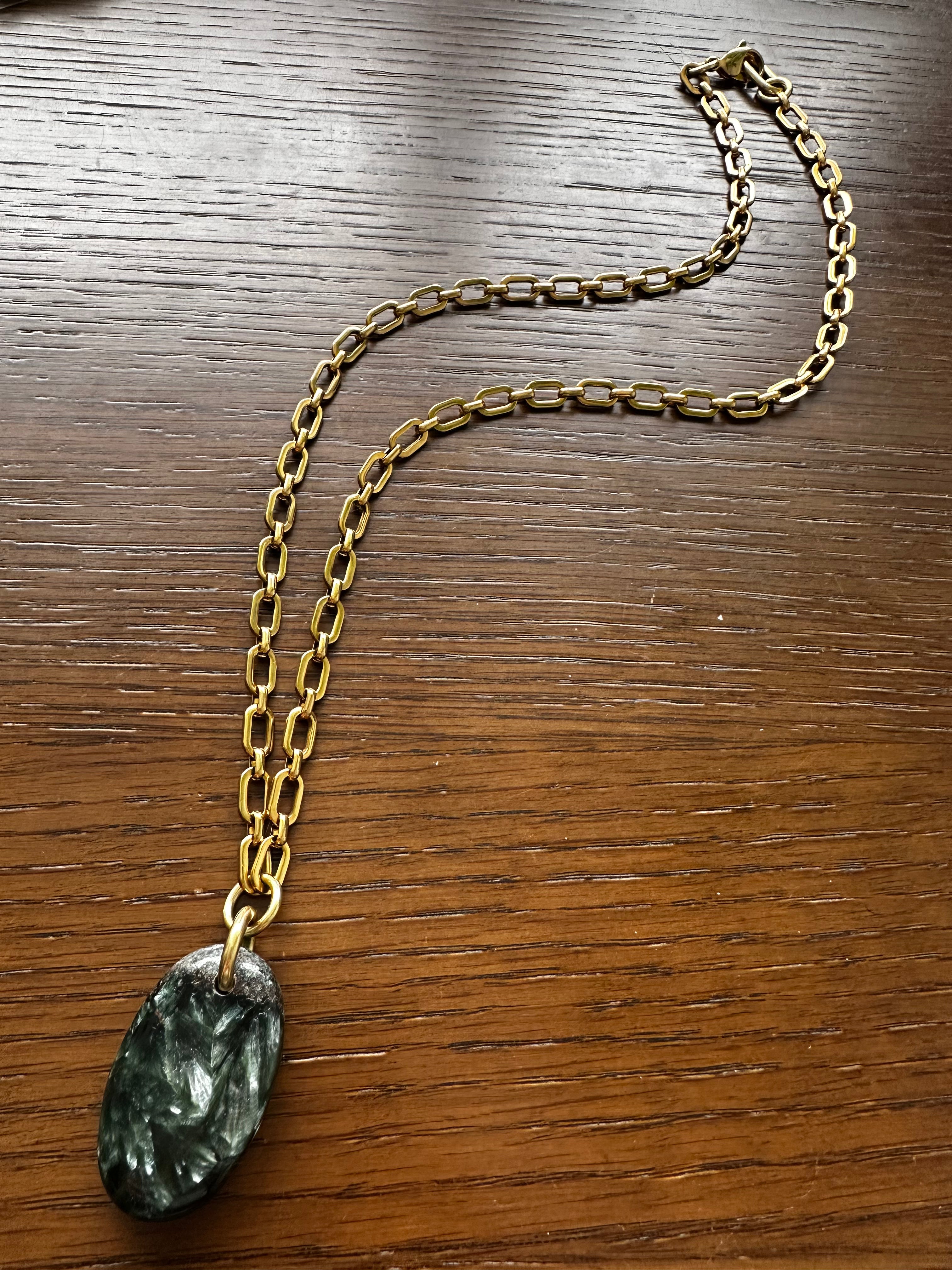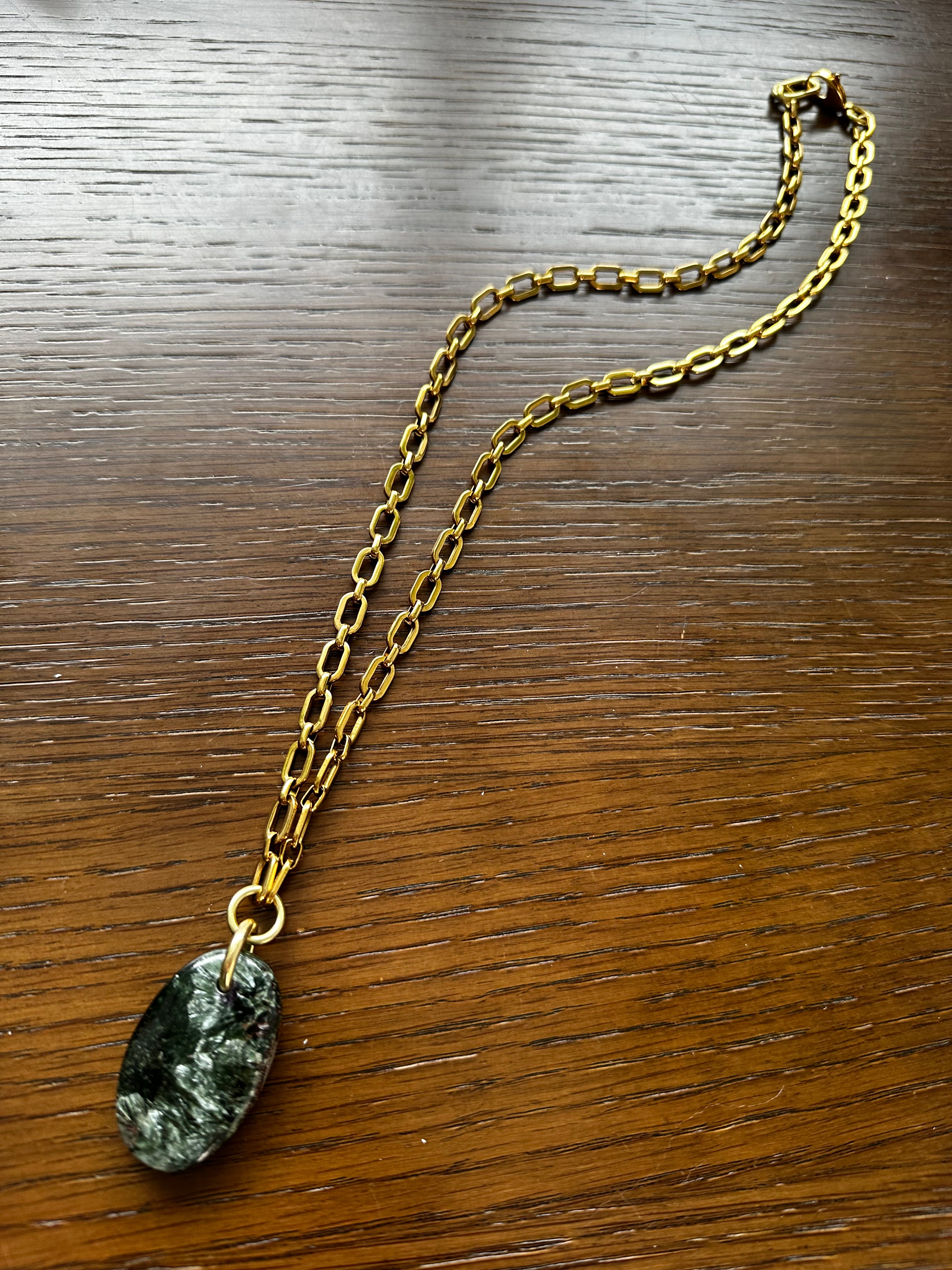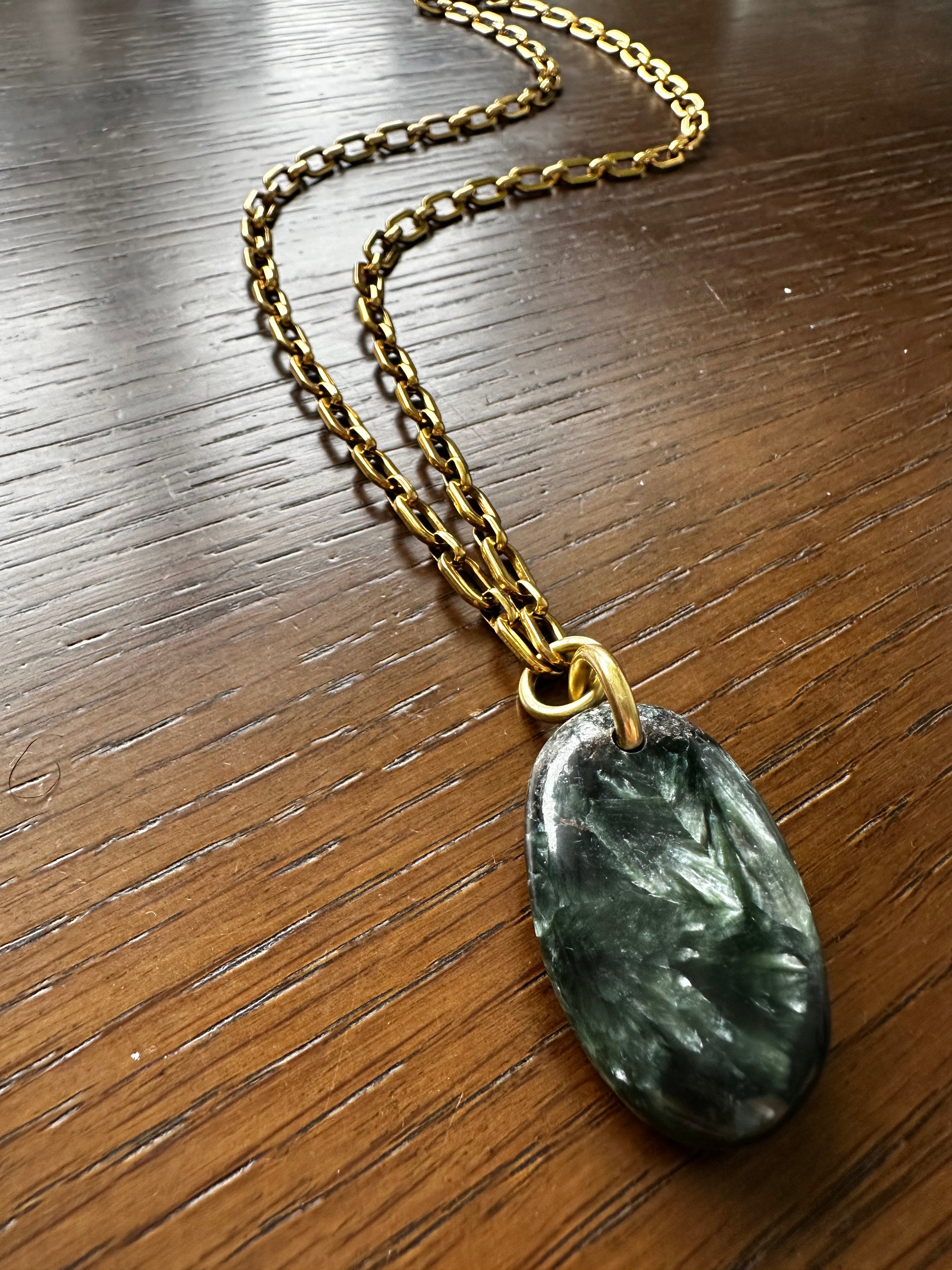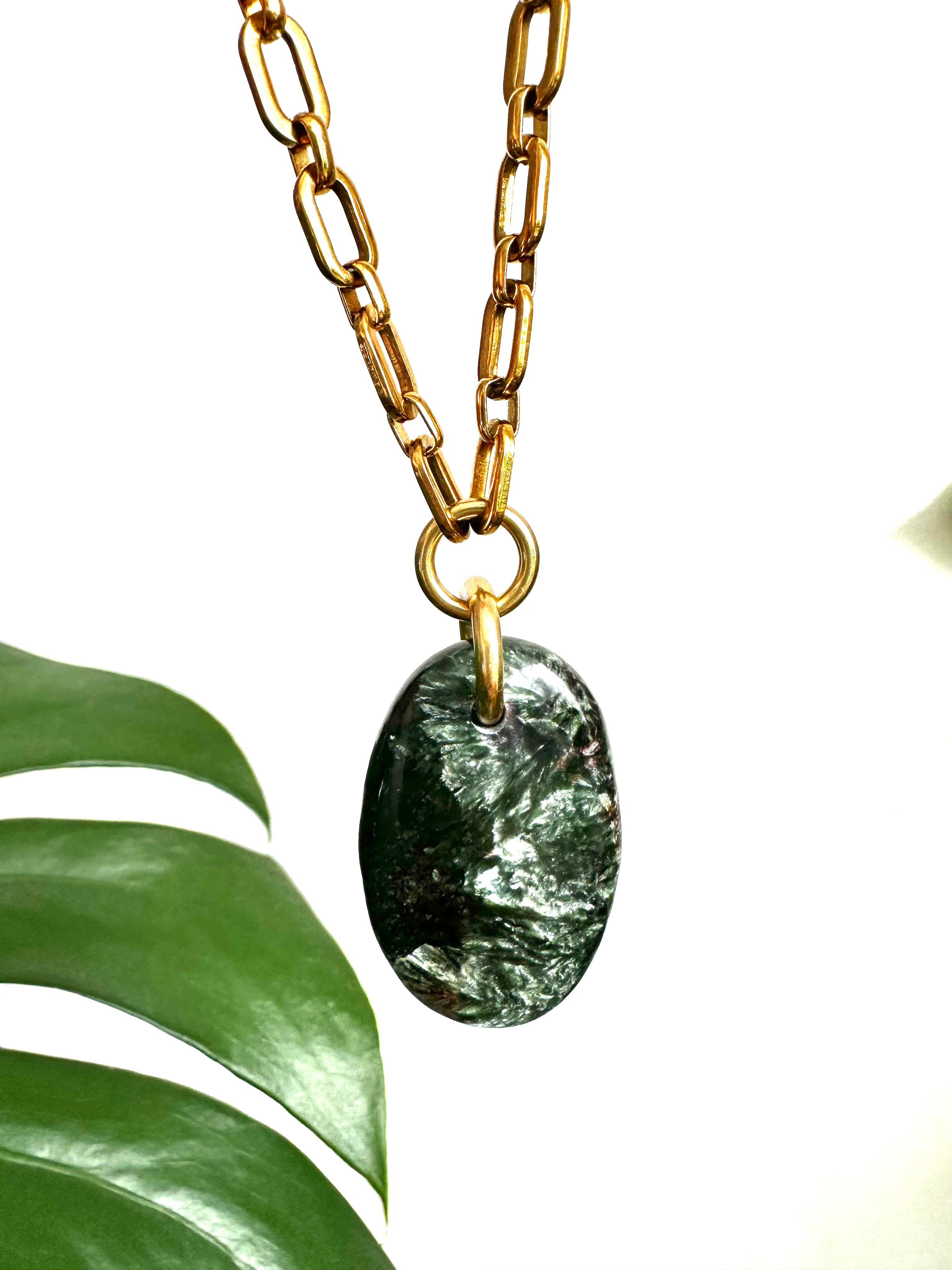 Each Seraphinite Armour necklace features a polished Seraphinite pendant approximately 1.5 inches in height, suspended from a gold-plated stainless steel paperclip chain. The stone’s subtle shimmer reveals itself gently with movement, offering a quiet luminosity rather than overt shine.