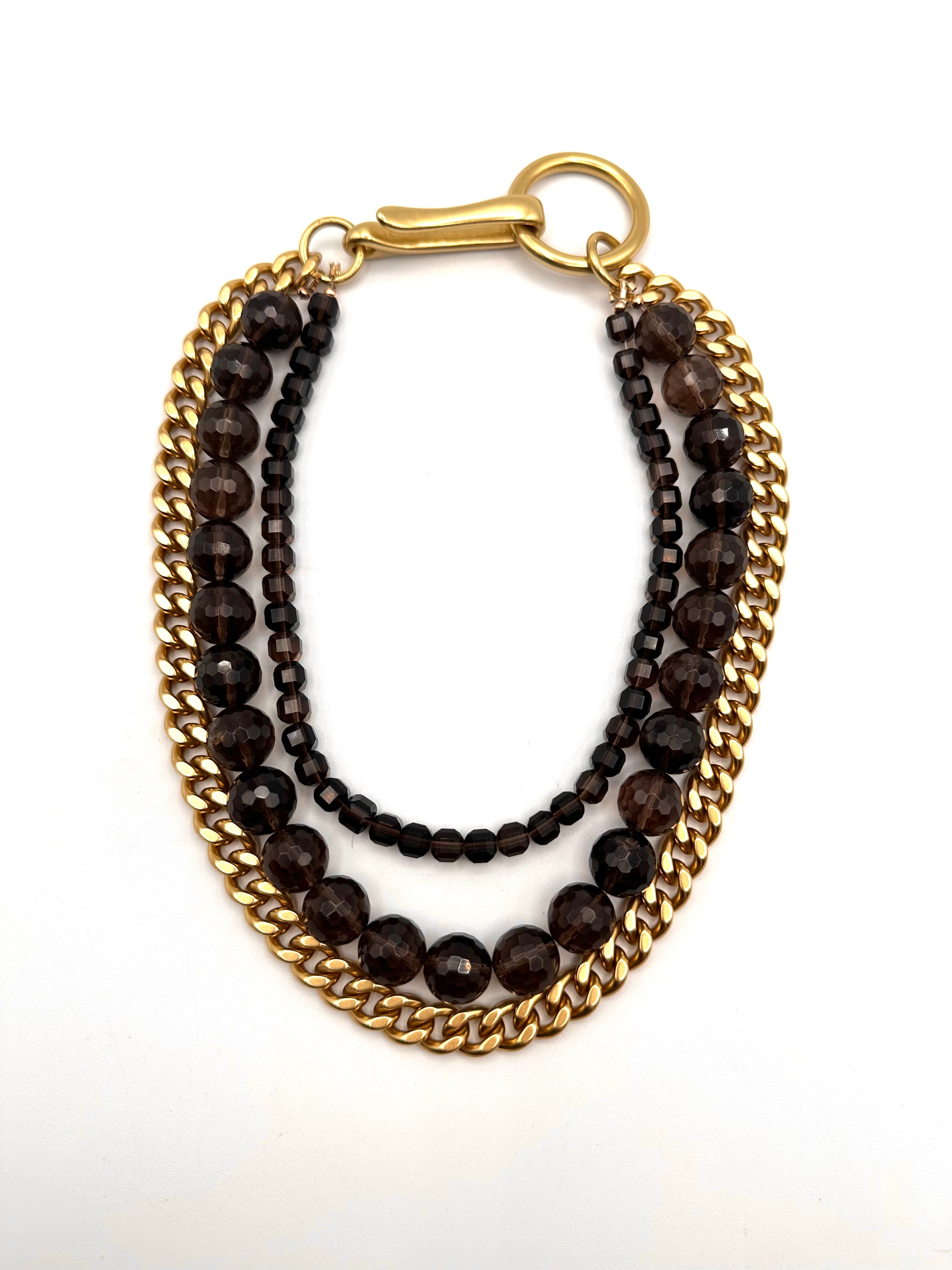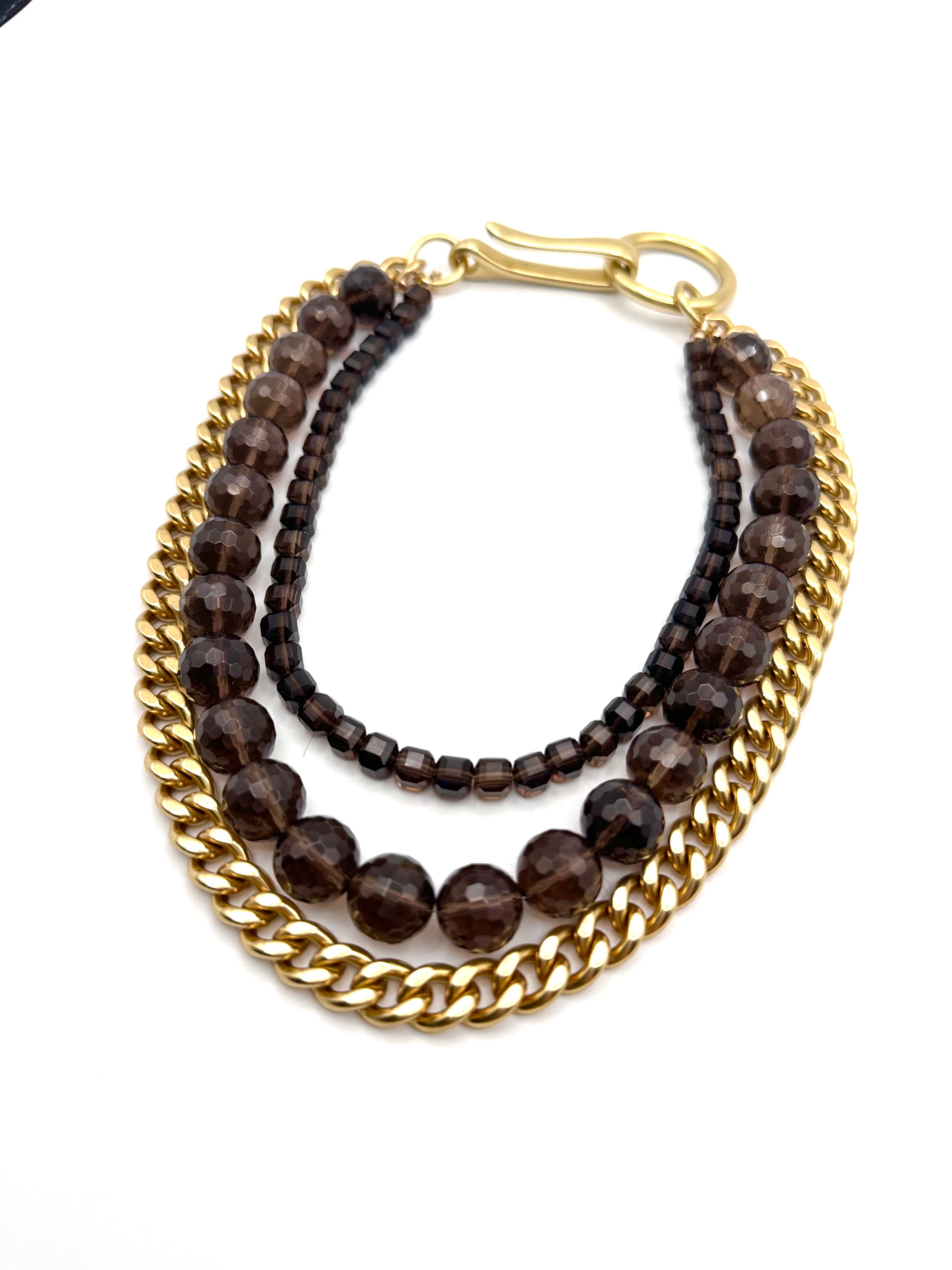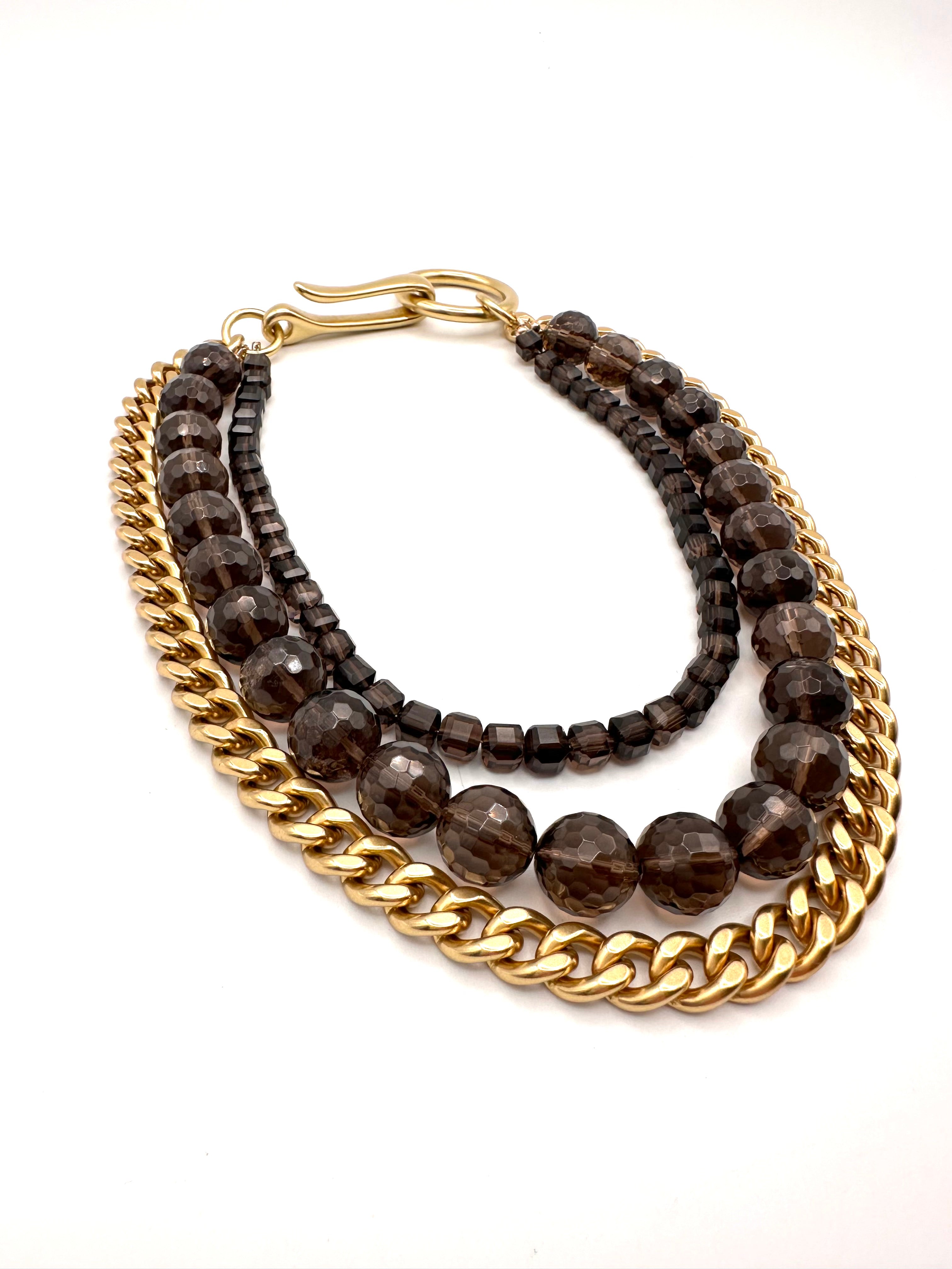 This Smokey Quartz Armour is a three-strand necklace inspired by our Signature Onyx Armour — a refined and elevated take on a classic Ashera design. Featuring 12mm high-quality faceted Smokey Quartz, paired with 6mm square faceted Smokey Quartz and our Medium Natural Brass Cuban Link chain, it offers a soft, elegant sparkle perfect for the holiday season and every day after. The natural brass fish-hook clasp adds a bold, sculptural finish.