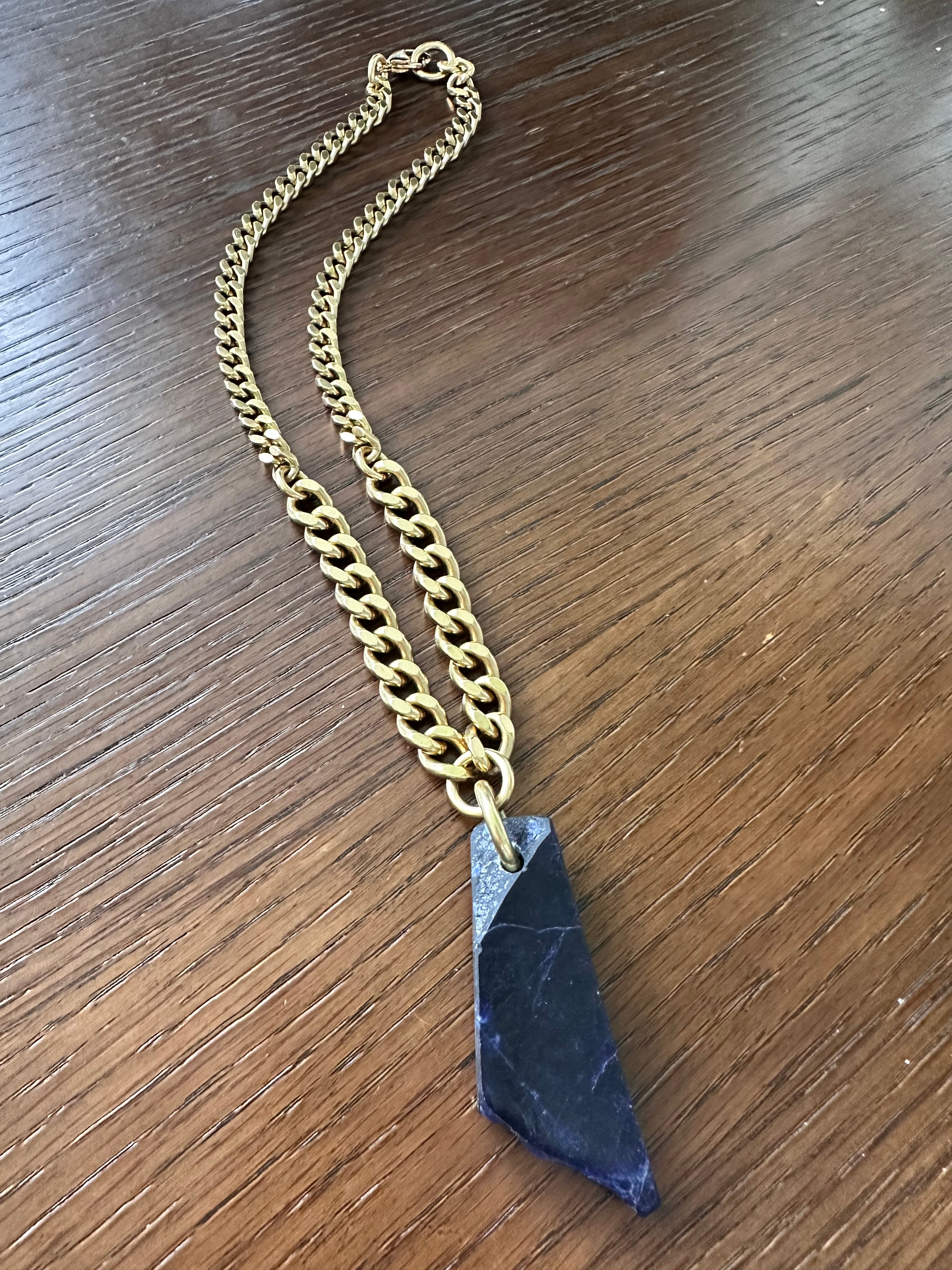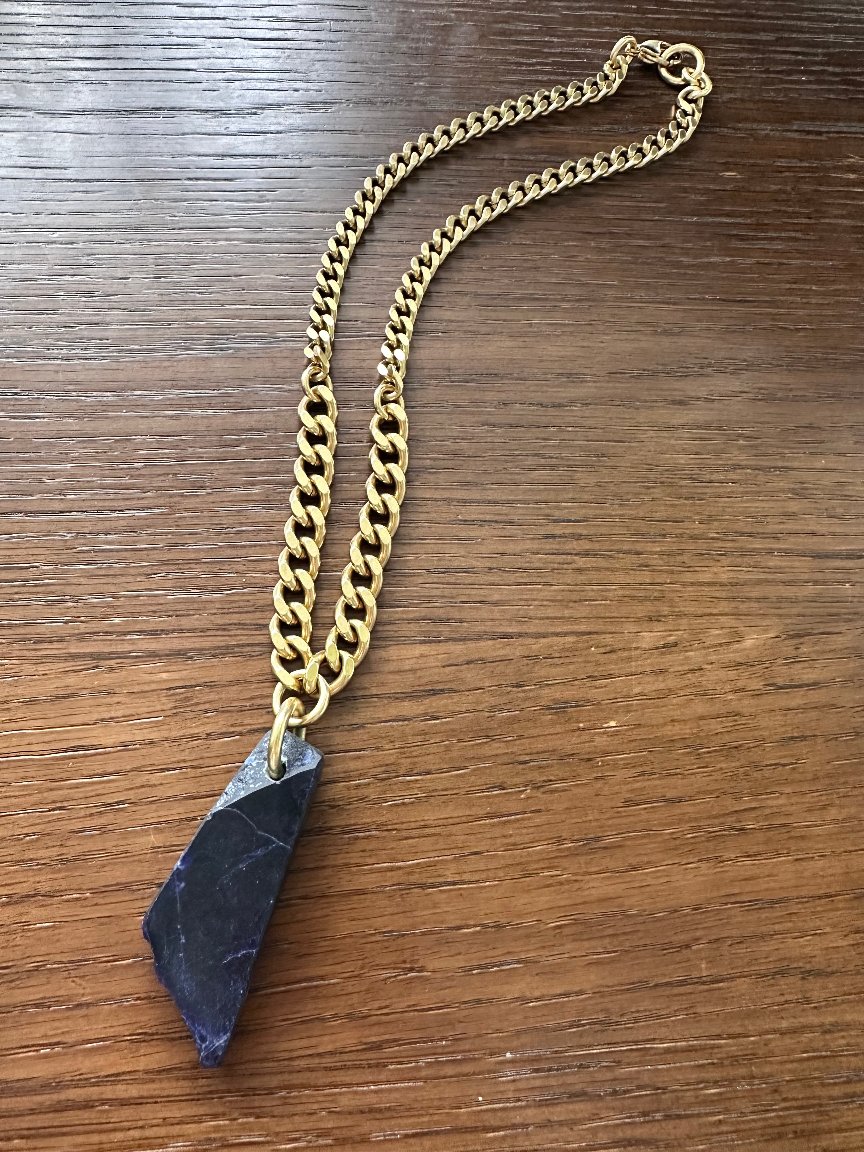 The pendant is entirely one of a kind and custom cut exclusively for Ashera Armour, intentionally shaped to preserve elements of the stone’s natural texture. Finished with a soft matte surface, the Sodalite retains an organic, tactile quality that reflects its raw and grounding character.