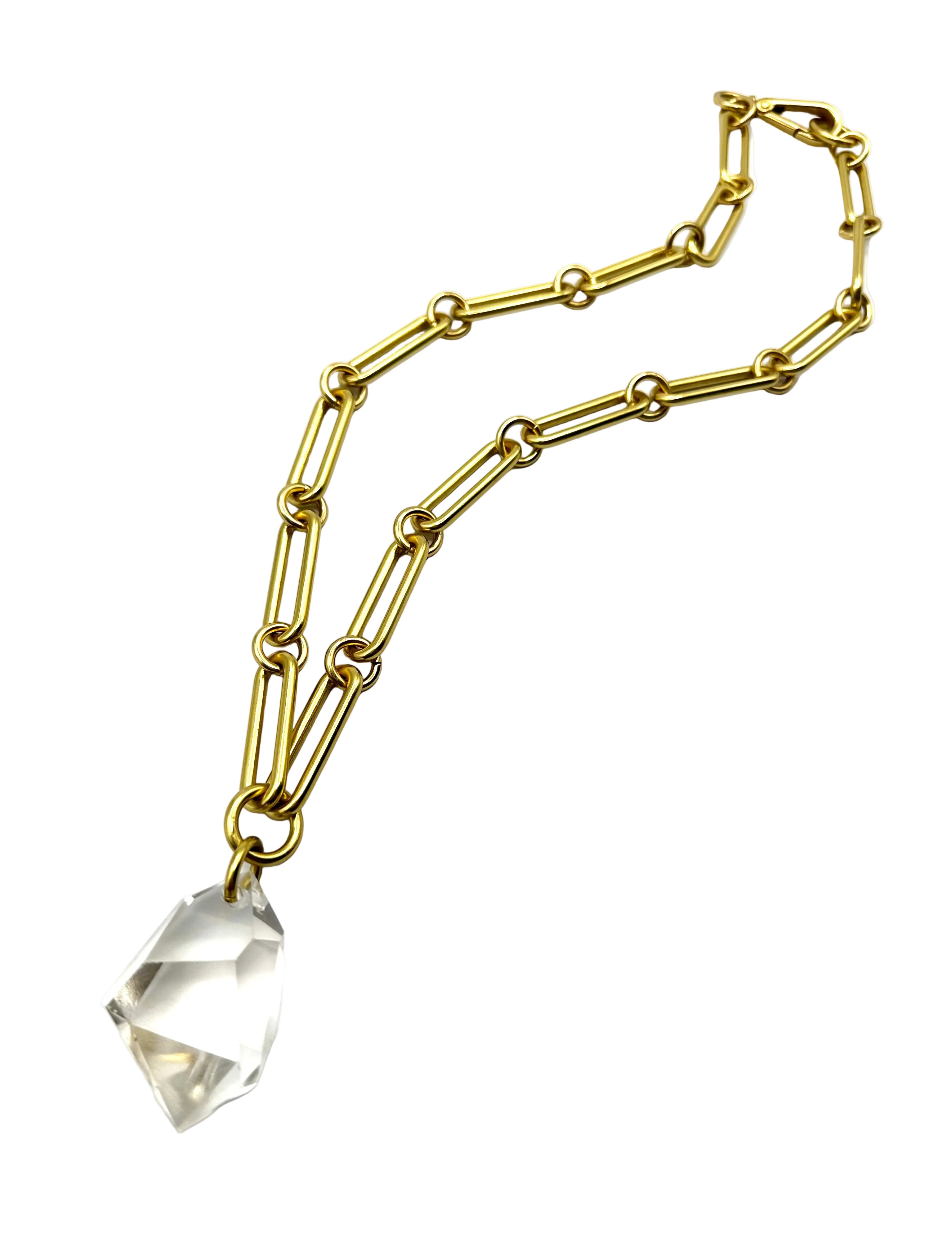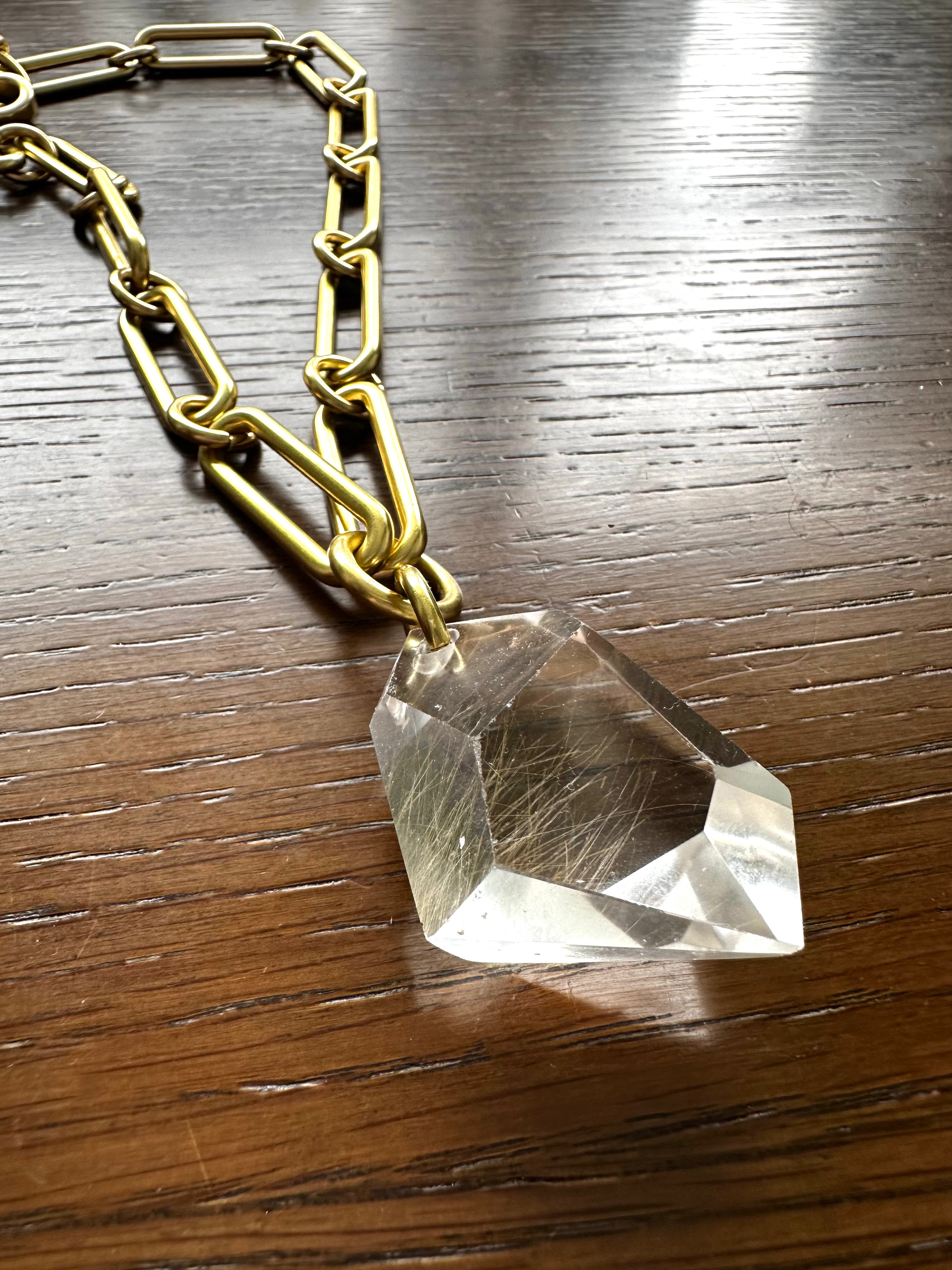 The pendant is suspended from our new large handcrafted paperclip chain, made of natural brass and treated to be tarnish resistant. The weight and structure of the chain ground the stone’s clarity, creating harmony between strength and refinement.
